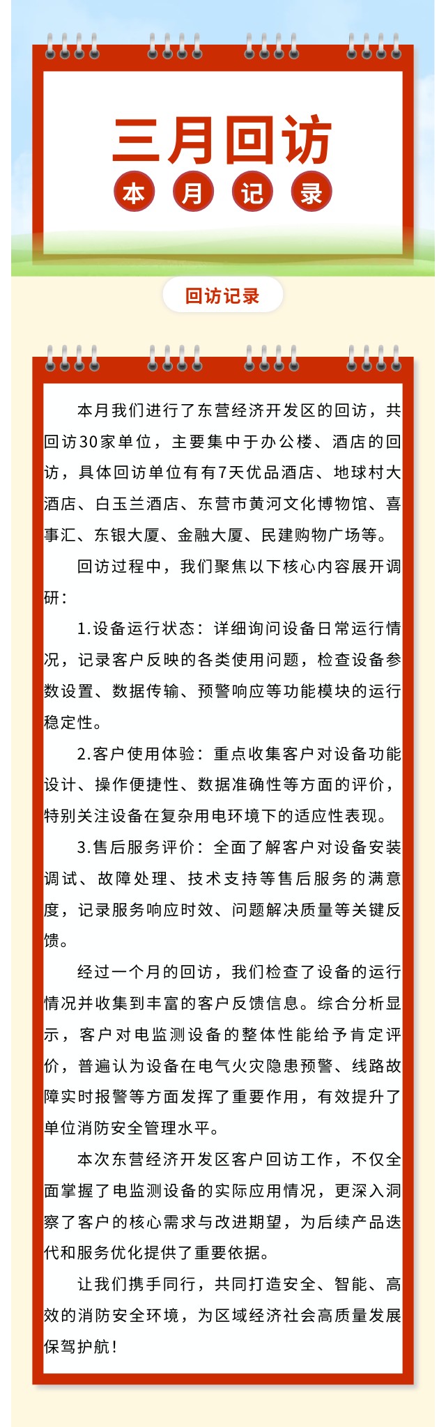 公司以社会安全建设为发展核心,以物联网建设为发展方向,肩负“用智慧创造安全,用物联改变生活”的使命,以“成就员工、回报股东,保障安全,服务社会”为宗旨,以“构建社会化安全服务平台”为己任,力承为社会消防安全管理做出贡献。目前,我们已经为数千余家机关事业单位、学校、幼儿园、医疗机构、养老机构以及家庭用户建立了完善的智慧安全管理平台,并提供了优质的服务。